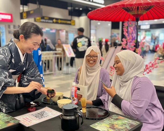 At the booth, the tea master and tea practitioner from OMOTESENKE DOMONKAI International Association Kuala Lumpur Unit, provided explanations on the overview and history of the Japanese tea ceremony, while also offering visitors the opportunity to experience preparing tea themselves. In addition, visitors were able to try on yukata and happi, and received copies of niponica, a magazine on Japan published by the Ministry of Foreign Affairs of Japan, as well as tourism brochures from various regions of Japan.