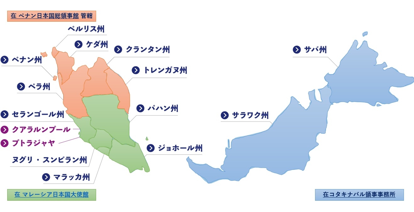 | 在ペナン日本国総領事館 | ペナン州、ペラ州、ケダ州、ペルリス州、クランタン州及びトレンガヌ州 |