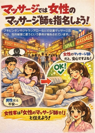 ● ブキビンタンやジャランアローなどの繁華街には、観光客向けの足裏マッサージ店がたくさんあります。もちろん腕が確かな店も多いですが、なかには女性客が男性マッサージ師にセクハラまがいの施術を受けたとの声も聞かれています。男性マッサージ師がご心配な場合は、最初に女性のマッサージ師の希望をお伝えすることも必要です。