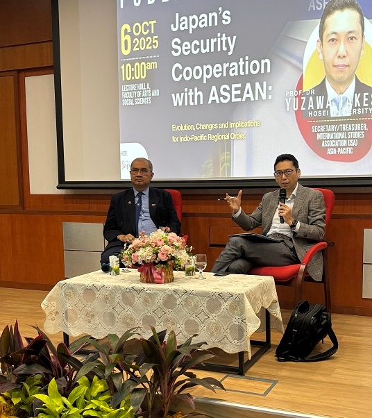 湯澤武法政大学教授による講演 令和7年10月7日 English 10月6日、当館は、湯澤武法政策教授をお招きし、マラヤ大学との共催で、同大学において「日本のASEANとの安全保障協力:進化、課題、そしてインド太平洋地域秩序への影響」をテーマに講演会を実施しました。当地有識者、大学関係者等の多くの参加者を得て、講演に引き続き活発な質疑応答、意見交換が行われました。