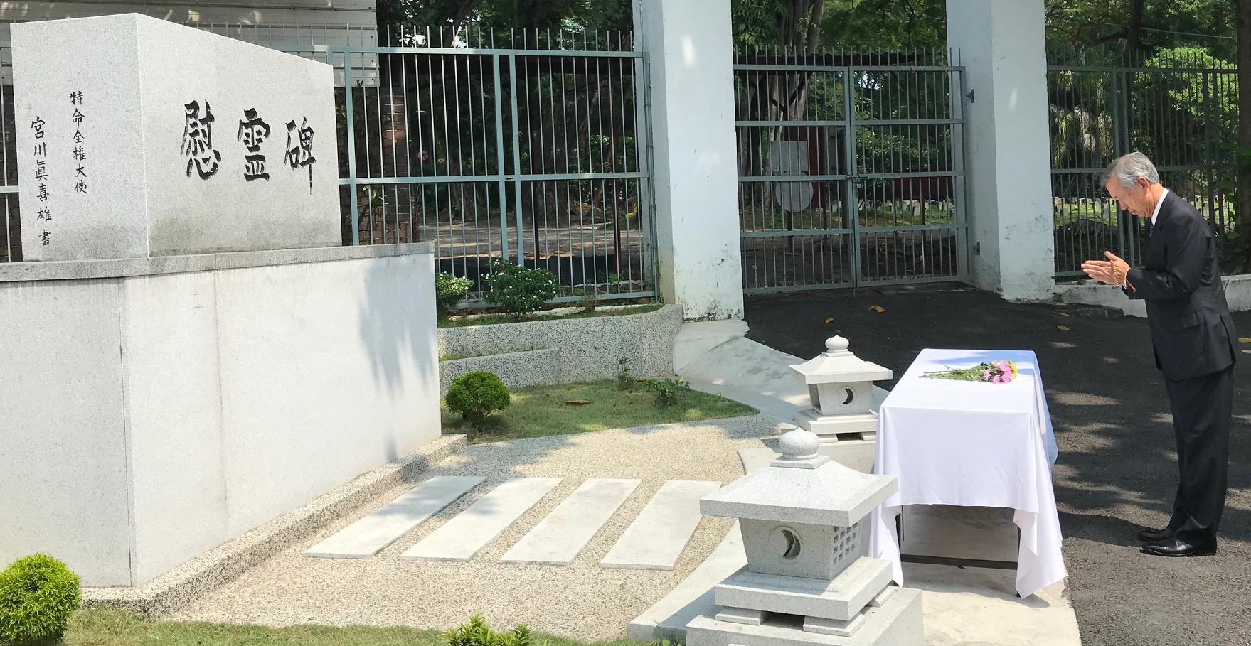 | 慰霊碑に礼拝する宮川大使 |