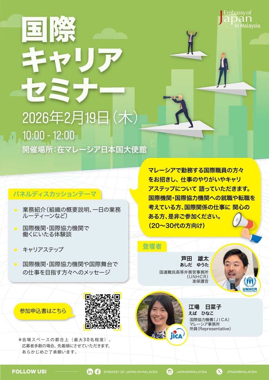 マレーシアで勤務する国際機関・国際協力機関で活躍されている方々をお招きし、お仕事の内容、やりがいやキャリアステップについて語っていただきます。国際機関・国際協力機関への就職や転職を考えている方、国際関係の仕事に関心のある方、ぜひご参加ください!