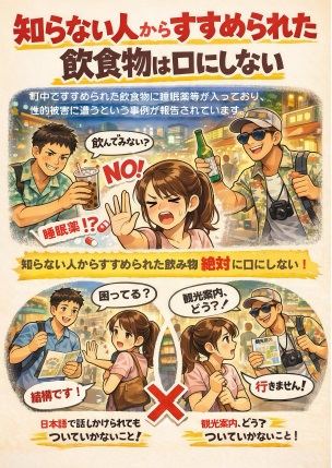 ・ 街中で、知らない人(又は初対面に近い者)に勧められた飲食物には、睡眠薬等が入っている可能性もあるため、絶対に口にしない。